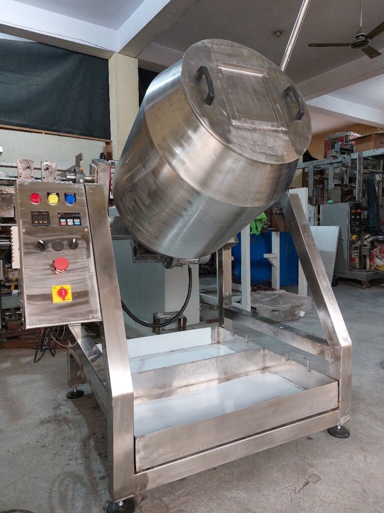 To apply seasoning and coating to the prepared roasted or fried product in a uniform manner, Namkeen mixers are widely used. The machine generally consists of mixing mechanism along with a heavy-duty motor to mix the products of different types and weights. This machine is widely used in snacks and namkeen industries. The coating pan of the machine is available in different sizes with different mixing capacities. This machine is based on a strong metal base to give it a still platform for working. The machine does the mixing works by tilting the products in its coating pan appropriately.